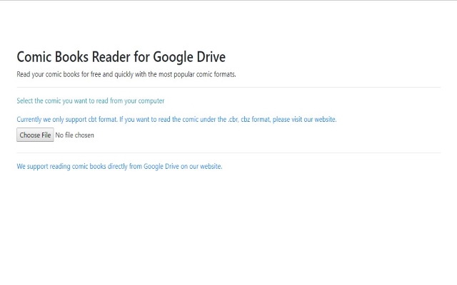 Read your favorite comic books now. You can read your comic books directly. Simply open your comic books which are located on your Google Drive. We support many formats such as cbr, cbz and cbt. Read your comics now.